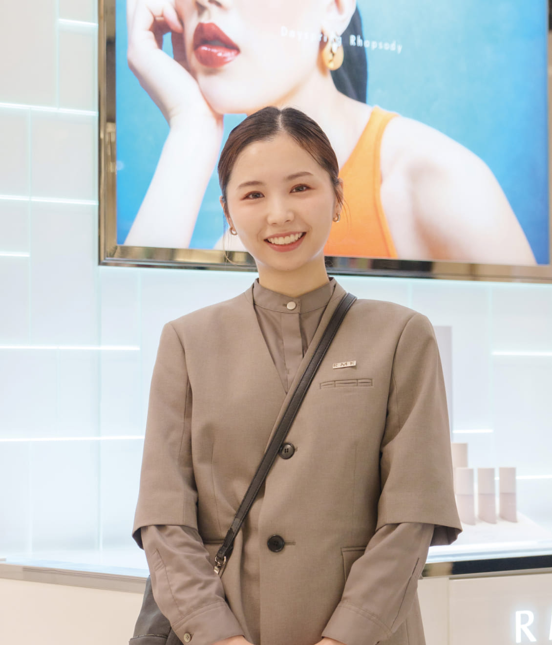 1997年にデビューした日本発メイクアップアーティストブランド、RMK。固定観念にとらわれない斬新さや先進性を取り入れ、それぞれの固有美を活かすメイクアップを提案している。船越は京美卒業の2018年に入社後、サブチーフに昇格。現在は大丸京都店にて、美容部員としてはもちろん、店の責任者として部下の指導にあたっている。